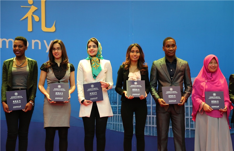 国际学院副院长赵海云宣读了2015年度北京市-北航优秀外国留学生奖学金获奖学生名单。130名留学生分获北京市—北航优秀外国留学生奖学金学习优秀奖和杰出表现奖。奖学金一等奖获得者、来自阿尔及利亚的博士研究生法瑞兹同学和来自印度尼西亚的本科生吴佳秋同学先后代表获奖学生发言。