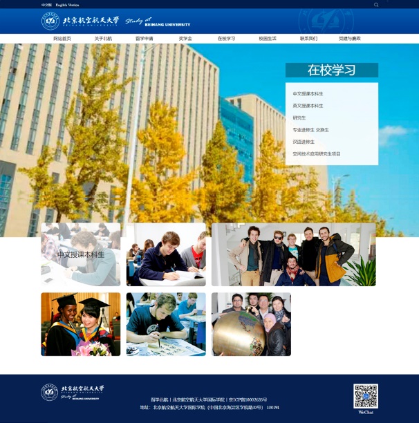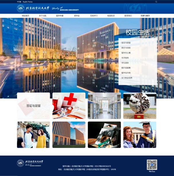 校园生活:为在校留学生提供留学北航期间签证居留、医疗保险、学生公寓、生活指南、学生媒体、实习就业等多方面信息
