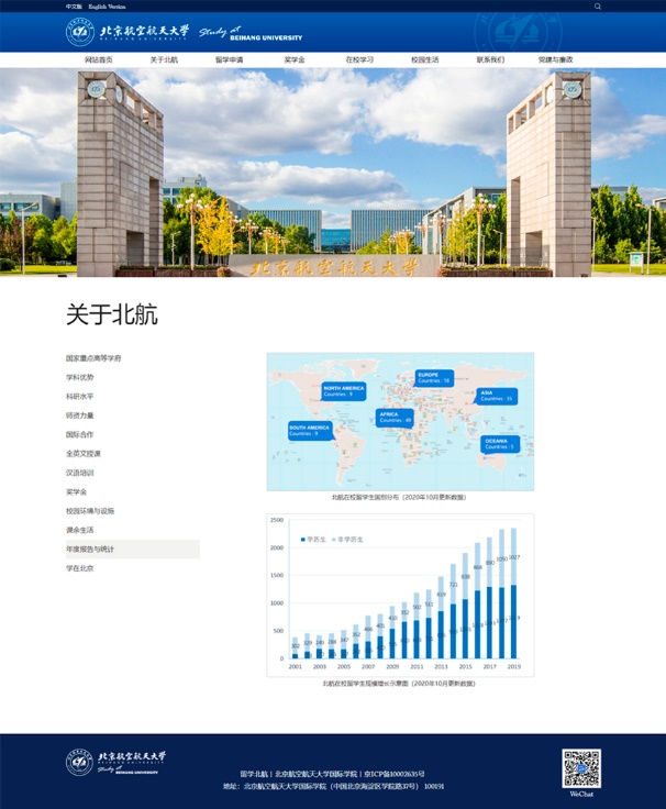 新版“留学北航”官网主要包括:关于北航、留学申请、奖学金、在校学习、校园生活、联系我们等6大栏目,内容分布在42个二级页面中。