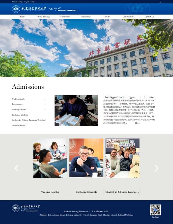 同时,新版“留学北航”官网内容与北航官网及国际学院“留学北航”微信公众号(Wechat ID: IntlBeihang)信息同步,多渠道、全方位为留学生提供信息服务。